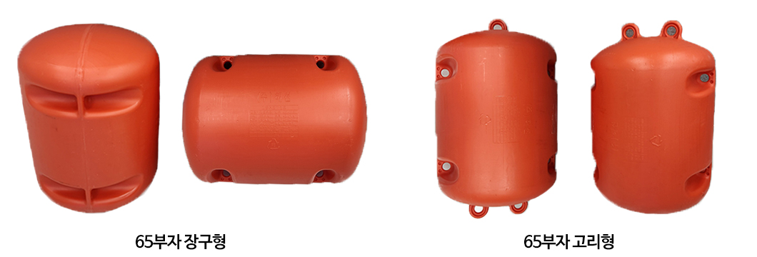 장구형부자 52L, 65L, 120L, 140L 및 가두리부자 220L, 250L, 대형부자 380L, 420를 개발완료 하였으며, 완도, 해남, 고흥, 장흥, 여수에 굴부자,멍게부자용으로 적용예정이며, 특히 고리 부분의 형상은 어민 사용시 찌그러짐.부서짐 등을 보완한 내구성을 높인 구조로 설계 제작되었습니다. 또한 부잔교 및 바지선, 해양선상집하장 등 제작에 필요한 자재들을 개발하고 있습니다.